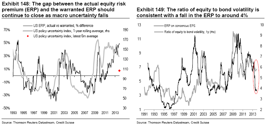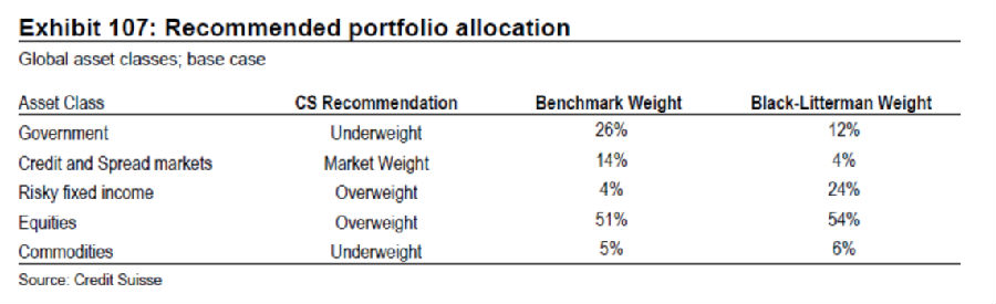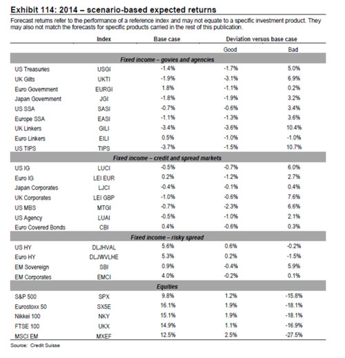 我們認(rèn)為2014年股市會(huì)有兩位數(shù)的回報(bào)率,而固定資產(chǎn)收益很大程度上會(huì)重演2013年的狀況——被壓制的回報(bào)率。在強(qiáng)于預(yù)期的經(jīng)濟(jì)活動(dòng)發(fā)生時(shí)我們不期望收益會(huì)上升,但是如果這種經(jīng)濟(jì)活動(dòng)減弱,我們則認(rèn)為收益將會(huì)下降。我們的Black-Litterman-type模型傾向于將資金配置于股票和固定收益資產(chǎn),而不是政府債券。如果增長(zhǎng)速度減緩,這有利于扭轉(zhuǎn)目前的局面,并且增加實(shí)際利率和新興市場(chǎng)主權(quán)風(fēng)險(xiǎn)。