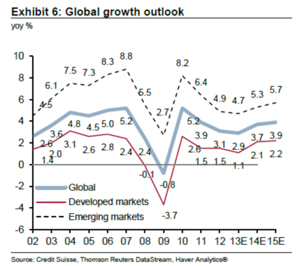 2014年全球經(jīng)濟(jì)看起來將是多年中最有秩序的,包括了由適度增長(zhǎng),低通脹,以及降低的增長(zhǎng)潛力組成的一個(gè)看似穩(wěn)定的三角關(guān)系。我們預(yù)期全球經(jīng)濟(jì)增長(zhǎng)將繼2013年的2.9%之后增速,并在2014年達(dá)到3.7%。發(fā)達(dá)市場(chǎng)經(jīng)濟(jì)體增長(zhǎng)加速,逐步縮小與新興市場(chǎng)的差距。我們預(yù)測(cè),上行風(fēng)險(xiǎn)可能集中于資本投資,下行風(fēng)險(xiǎn)集中在央行的政策對(duì)金融穩(wěn)定的溢出效應(yīng),尤其是美聯(lián)儲(chǔ)的量化寬松政策的退出。