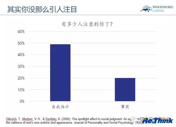 他們讓一些學生穿上一件非常夸張的T恤,從學校里的階梯教室門口走進去。學者讓這些學生猜,教室里大約有多少其他學生會注意到他/她。然后學者又問教室里那些學生,有多少人記得剛剛進入教室的那位學生身穿的T恤上是什么圖案?結果如下。