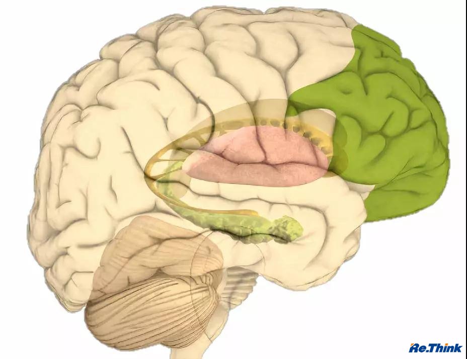 女性在情緒上更不容易沖動,青春期時,女生比男生早熟1~2年。因為女性前額葉皮層比男性大(下圖右邊綠色部分)。